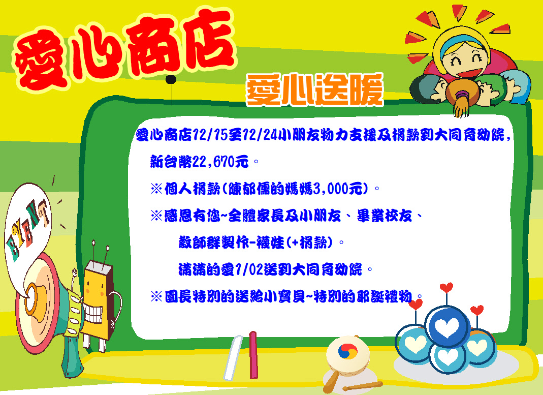 愛心商店12/15至12/24小朋友物力支援及捐款到大同育幼院, 新台幣22,670元